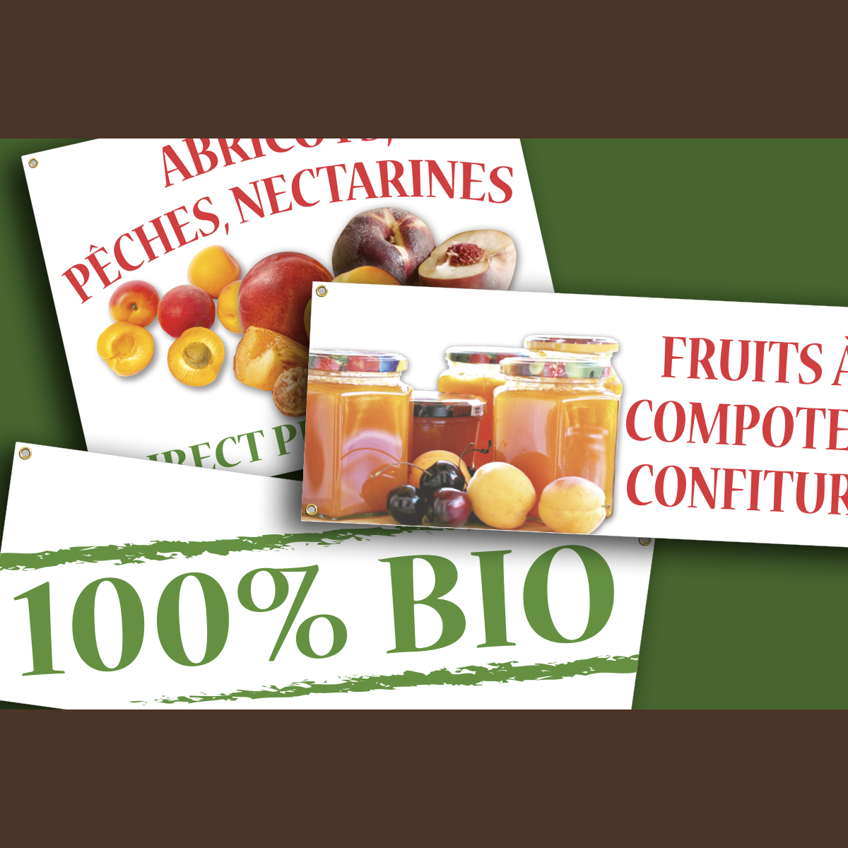 Pour habiller les fonds de stand sur une foire ou un salon, un étal sur le marché, annoncer comme chaque année la vente d'un produit de saison, ou pourquoi pas une enseigne à moindre coût, nous imprimons sur une bâche 550g, avec ourlets et nous adaptons les finitions à votre besoin nombre d'oeillets, ourlet ou fourreau avec drisse. Chaque banderole est faite sur mesure alors profitez-en !