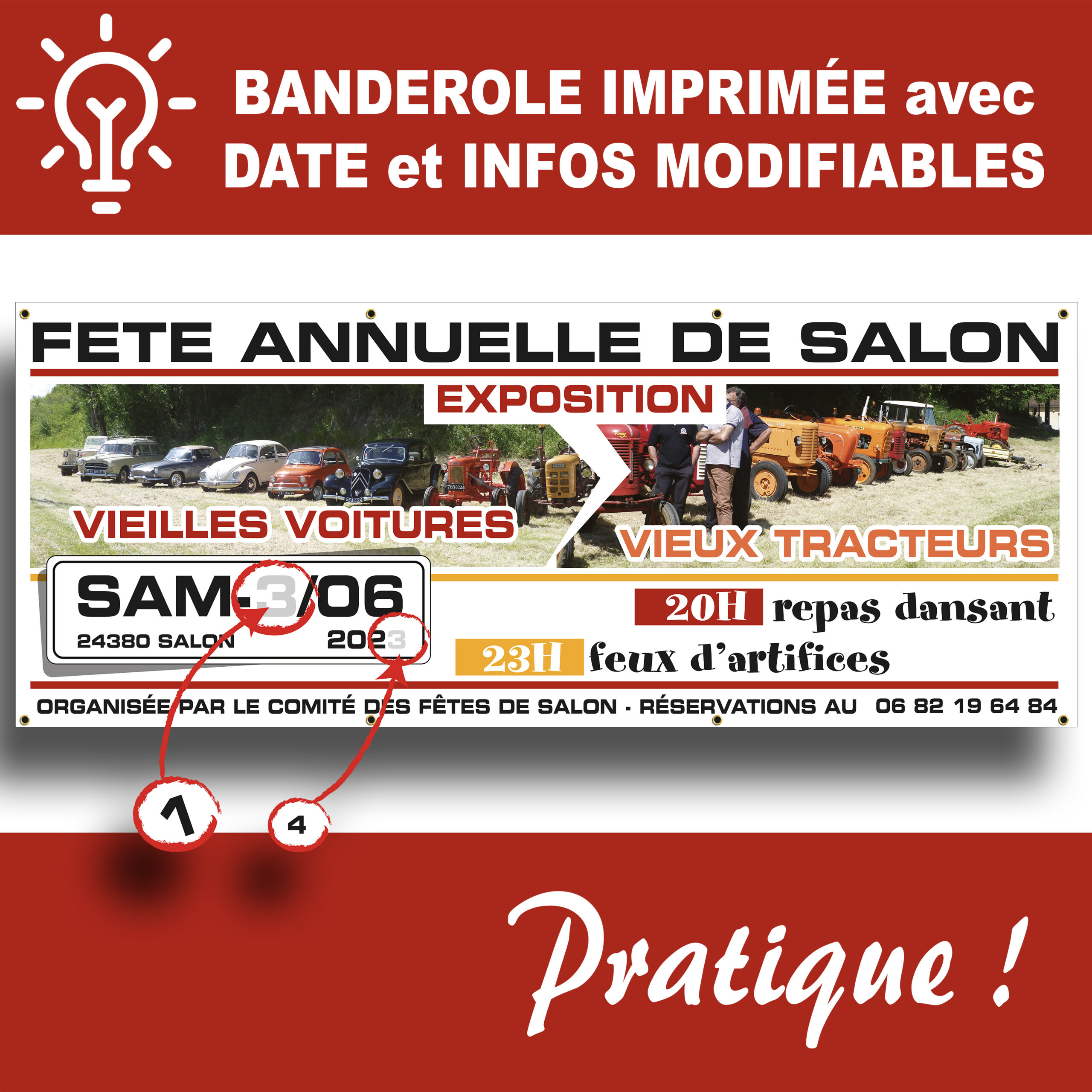 Pour tous les évènements récurrents, repas, fêtes, lotos, portes ouvertes,... nous n'imprimons que les informations qui ne changent pas, et les dates seront ajoutées en lettrage adhésif ce qui permet une réutilisation du support, et un prix à long terme très interessant. Bâche 550g, avec ourlets tout autour pour un maintient renforcé, oeillets tous les mètres et aux angles.